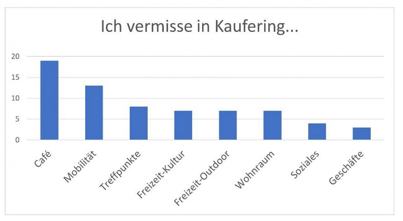 Mehr als ein Drittel der Befragten vermisst ein Café. Zum Themenkomplex Mobilität wurden der Wunsch nach einem barrierefreien Bahnhof, die Verbesserung des ÖPNV, der Anbindung an sich und der Ausbau der Radwege genannt. Als kommunale Treffpunkt-möglichkeiten werden Märkte, ein Mehrgenerationenhaus und ein Bürgertreff genannt. Ansonsten wurde der Wunsch nach Festivals, Weinfesten und im Outdoorbereich nach einer Boulebahn geäußert. Es fehlt an günstigem Wohnraum und einem Baugebiet v.a. für Familien aber auch an alternativen Wohnformen für Senioren. Mehr Wunsch nach mehr Aktionen für Senioren und Jugendliche wurde unter Soziales zusammengefasst. Ansonsten wird ein Blumenladen und ein Metzger in der Nähe des Fuggerplatzes vermisst.