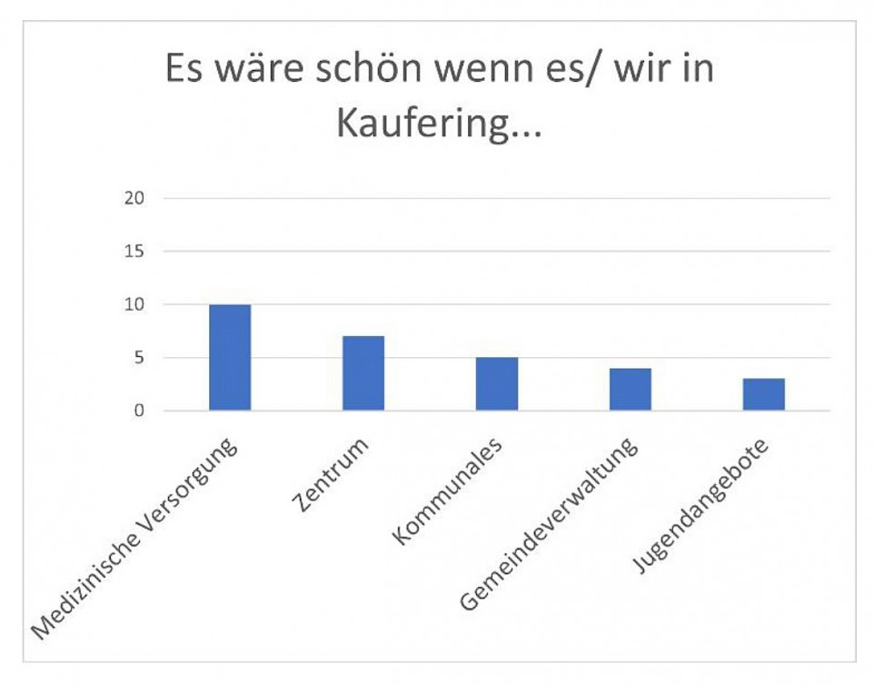 Es wurde die Verbesserung der medizinischen Versorgung genannt, außerdem kam mehrfach der Wunsch nach einem zentralen Platz als Ortskern und nach mehr kommunalen Veranstaltungen, wie z.B. Märkten. Veranstaltungen sollten besser beworben werden und die Suche nach Ehrenamtlichen vorangetrieben werden. Gerade auch für Jugendliche sollte es mehr offene Jugendarbeit geben.