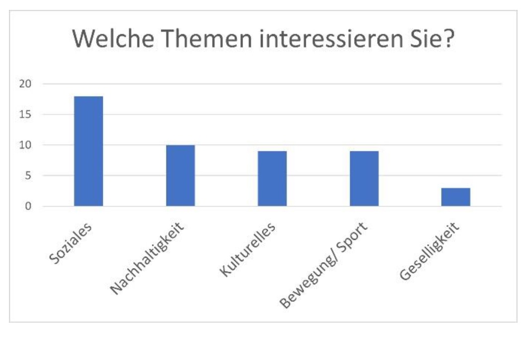 Themen, die für die Befragten von Interesse sind, kommen vor allem aus dem sozialen Bereich: Kinder, Jugendliche und Senioren. Aber auch Themen wie Nachhaltigkeit und Klimaschutz wurden mehrfach genannt. Ansonsten sind es die Kultur (Musik, Literatur) und Veranstaltungen dazu, die die Menschen interessiert. Unter Bewegung sind Spazierengehen, offener Bewegungstreff, Fitness und Fahrradfreundlichkeit subsummiert. Einige wünschen sich Möglichkeiten für mehr Geselligkeit, z.B. Spiele.