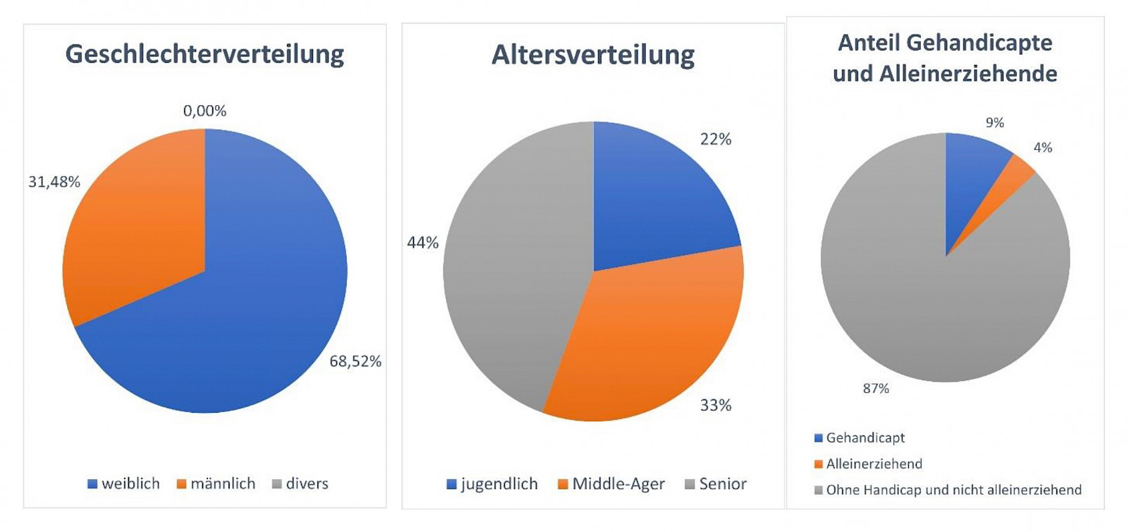 Die Verteilung der Geschlechter ist zwar nicht ganz gerecht, dafür sind die Teilnehmer nach Alter relativ gut aufgeteilt. Es gibt auch eine Personengruppe an gehandicapten Personen sowie Alleinerziehenden, die ihre Sichtweise eingebracht haben.