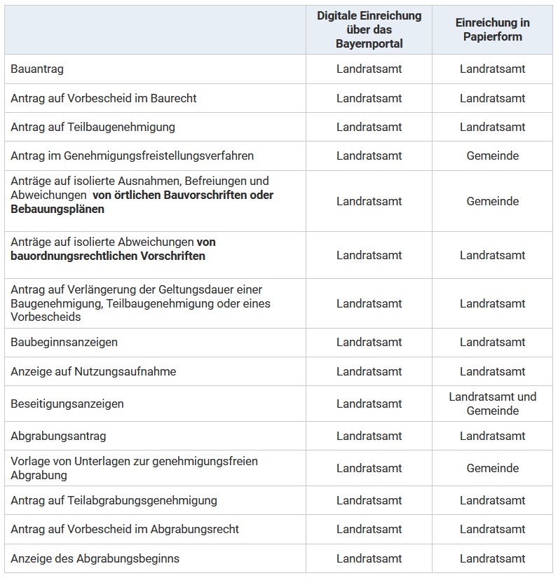 Immer mehr bayerische Bauaufsichts- und Abgrabungsbehörden bieten den Digitalen Bauantrag an. Er ermöglicht die digitale Einreichung aller gängigen bauaufsichtlichen und abgrabungsaufsichtlichen Anträge und Anzeigen.