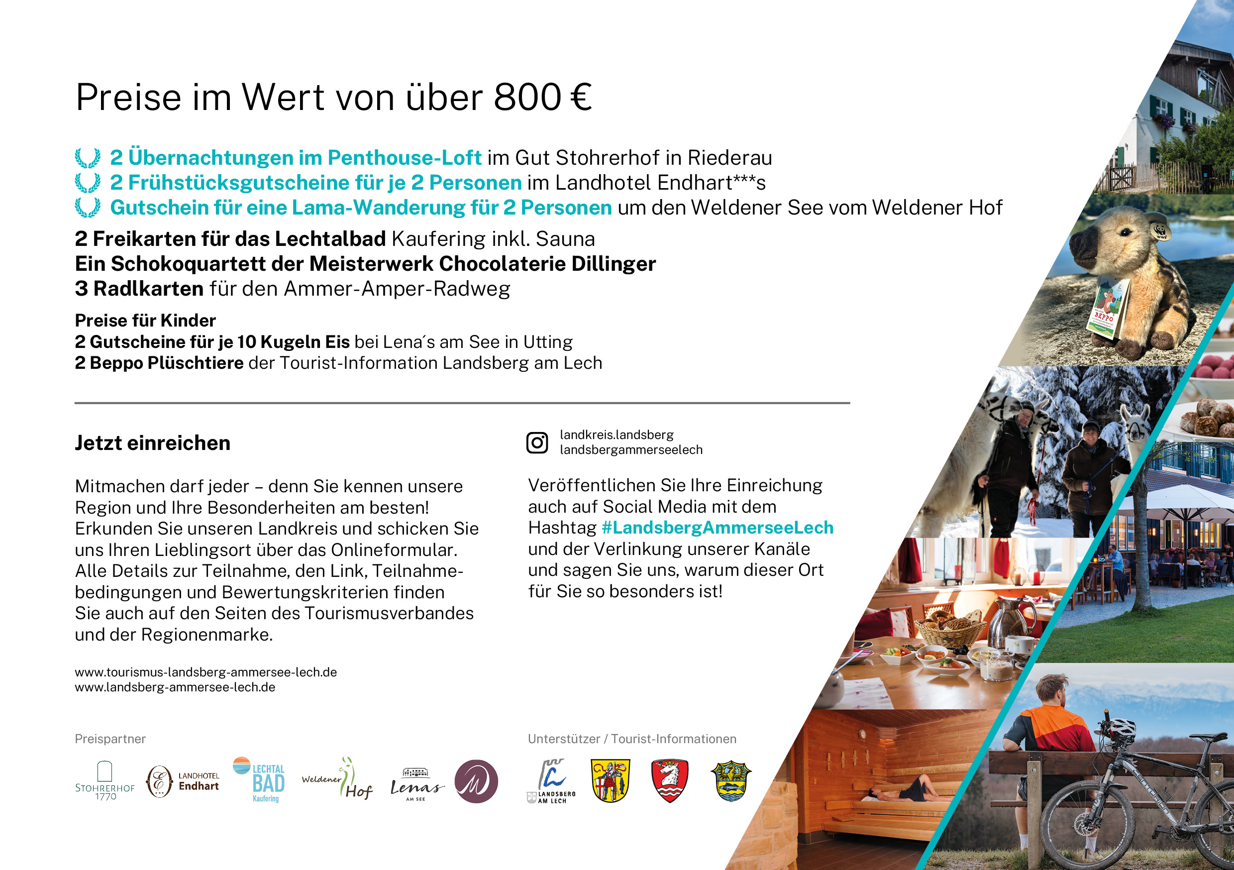 Eingereicht werden können alle Lieblingsorte - von besonderen kulturellen Einrichtungen, Museen, der schönste Aussichtspunkt, die beste Radlstrecke, der gemütlichste Wanderwege, das Lieblingsrestaurant, die beste Eisdiele, das schönste Café, außergewöhnliche Orte in der Natur oder am Wasser oder der traumhafteste Blick auf den Lech.